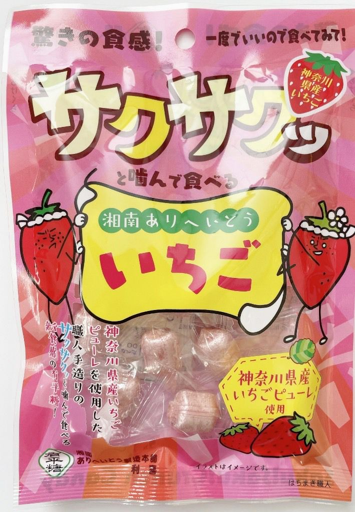 可愛い♥いちごのパッケージで新登場!極限までまで薄く延ばしたサクサク!「湘南ありへいとう」で「神奈川県産いちごピューレ」を包み込みました。